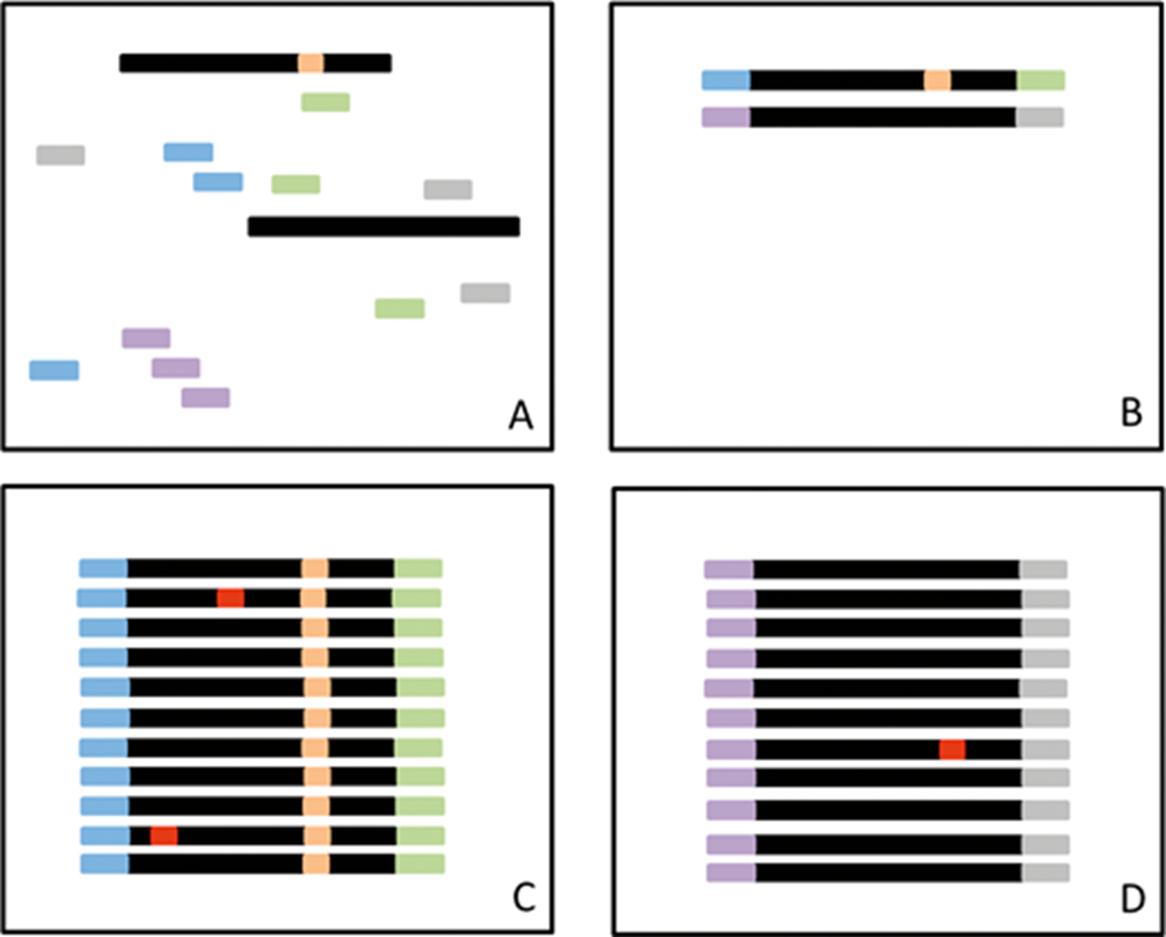 4:A,在扩增之前,将随机标签(短条)添加到 DNA 片段(黑色)中,其中一些具有突变(橙色)。B,标签随机附着在 DNA 片段上。C,在扩增过程中,一些拷贝会出现错误(红色)。所有片段都将被测序。只有在具有相同 ID 标签的所有测序读数的大部分(例如,95%)中检测到的突变才会被鉴定为真正的突变。D,在少数具有相同 ID 标签的读取中存在的突变被视为错误。