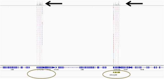 5:右侧显示CYP21A2基因和设计用于序列捕获的诱饵(表 2 )(绿色条)。左侧显示没有诱饵的CYP21A2假基因。与真实基因相似的测序读数被映射到假基因;由于读数非常相似,因此无法确定实际来源。这些读数的映射质量得分较低,因为读数映射到超过 1 个位置,如褪色所示。黑色箭头:覆盖范围(灰色峰),绿色圆圈:诱饵位置(如果有)。裁剪的集成基因组查看器 (IGV) 屏幕截图(Broad Institute,Cambridge,Massachusetts)。